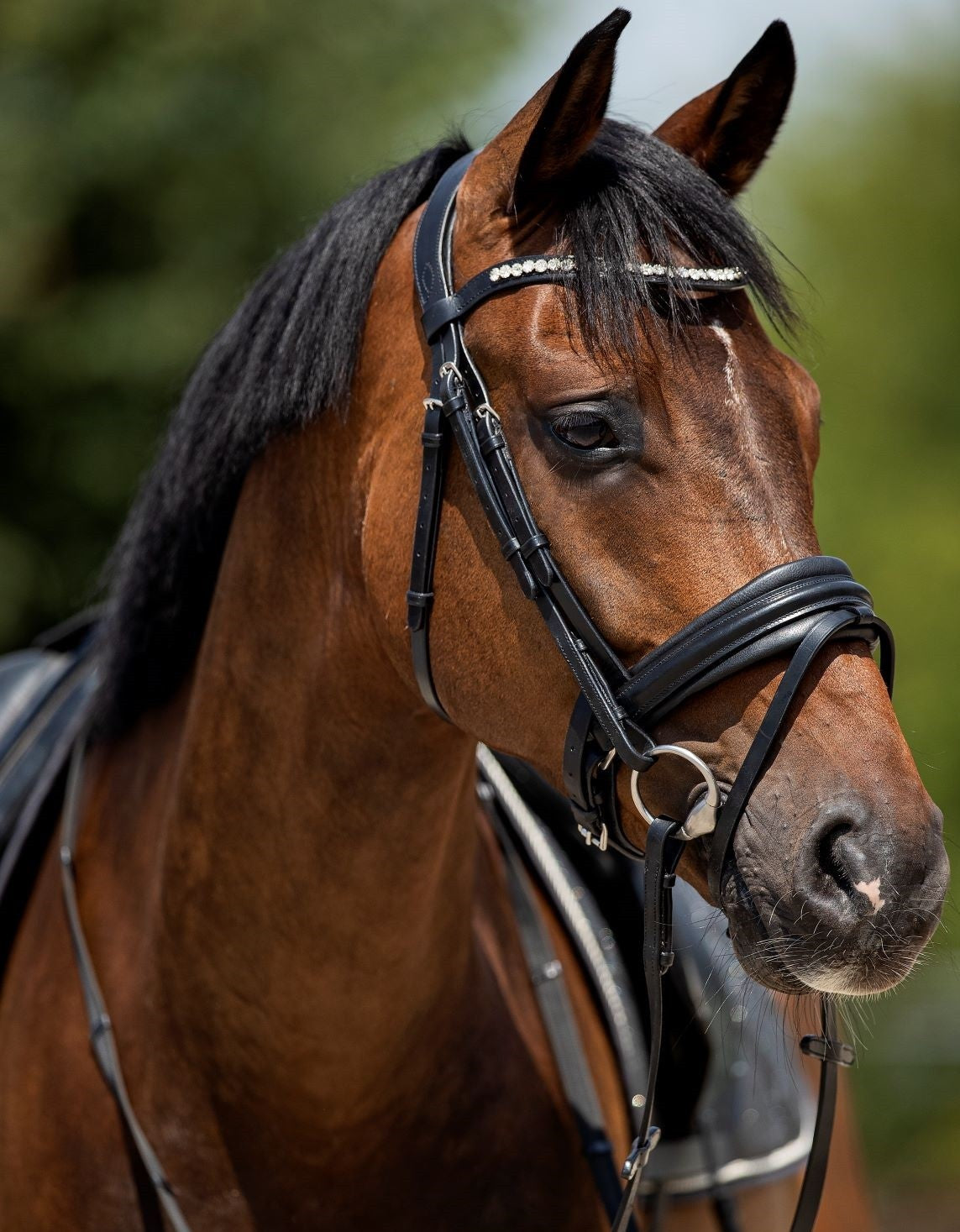 De frontriem is elegant afgewerkt met White Swarovski siersteentjes, wat een luxe en opvallende uitstraling geeft, perfect voor shows en wedstrijden.